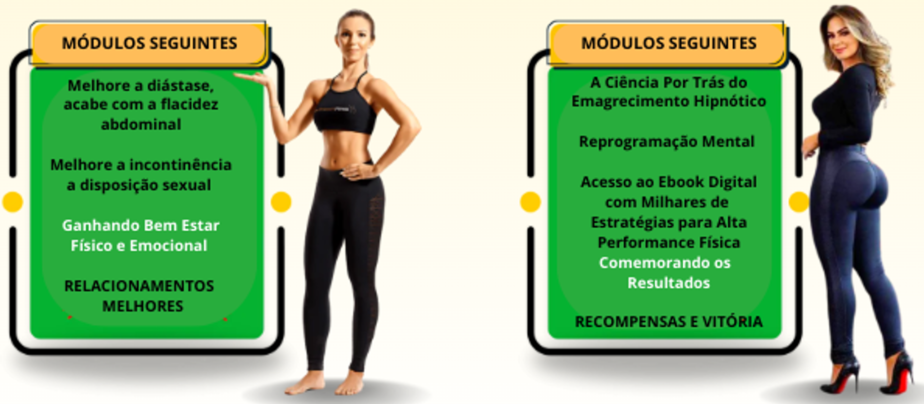 Você vai receber 12 Módulos projetados especialmente para emagrecer, sendo 10 vídeoaulas, 1 Áudio de Reprogramação Mental (40 minutos) e 1 Áudio de Hipnose (30 minutos), mais 1 E-book Livro digital (com mais de 200 páginas).